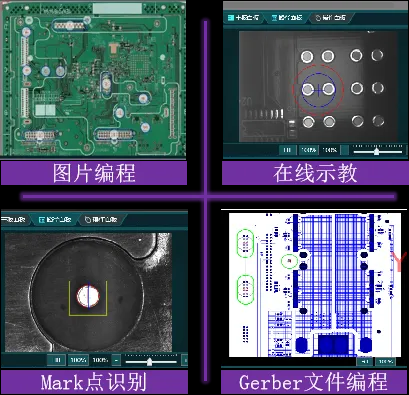 支持CAD、Gerber、坐標(biāo)文檔、圖片文檔多種方式進(jìn)行編程,標(biāo)配示教相機(jī),可在線視覺(jué)編程。支持離線編程。每個(gè)焊點(diǎn)參數(shù)都可獨(dú)立設(shè)置。全程可視化操作,在線調(diào)試方便快捷。自動(dòng)優(yōu)化焊接順序,節(jié)省焊接時(shí)間??商峁㎝ES系統(tǒng)接口。