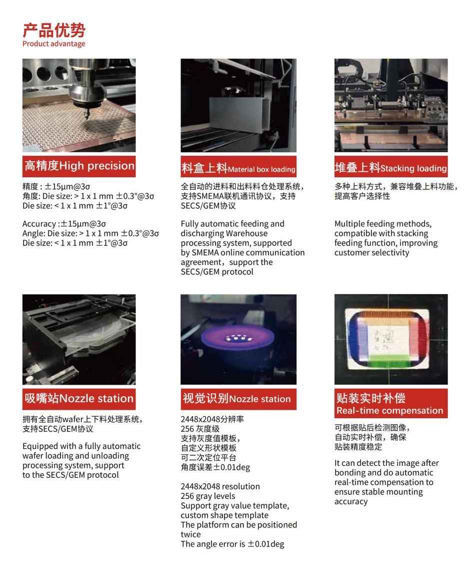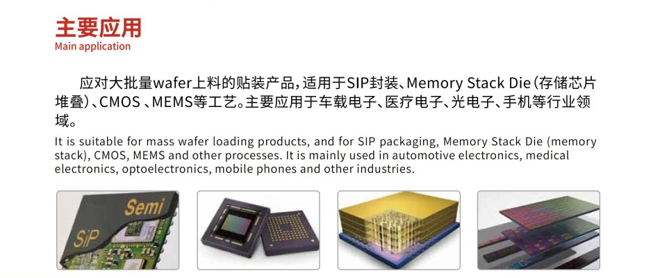 通用型高精度芯片貼合機(jī),應(yīng)對(duì)大批量wafer上料的貼裝產(chǎn)品,適用于SIP封裝、Memory Stack Die(存儲(chǔ)芯片堆疊)、CMOS 、MEMS等工藝。